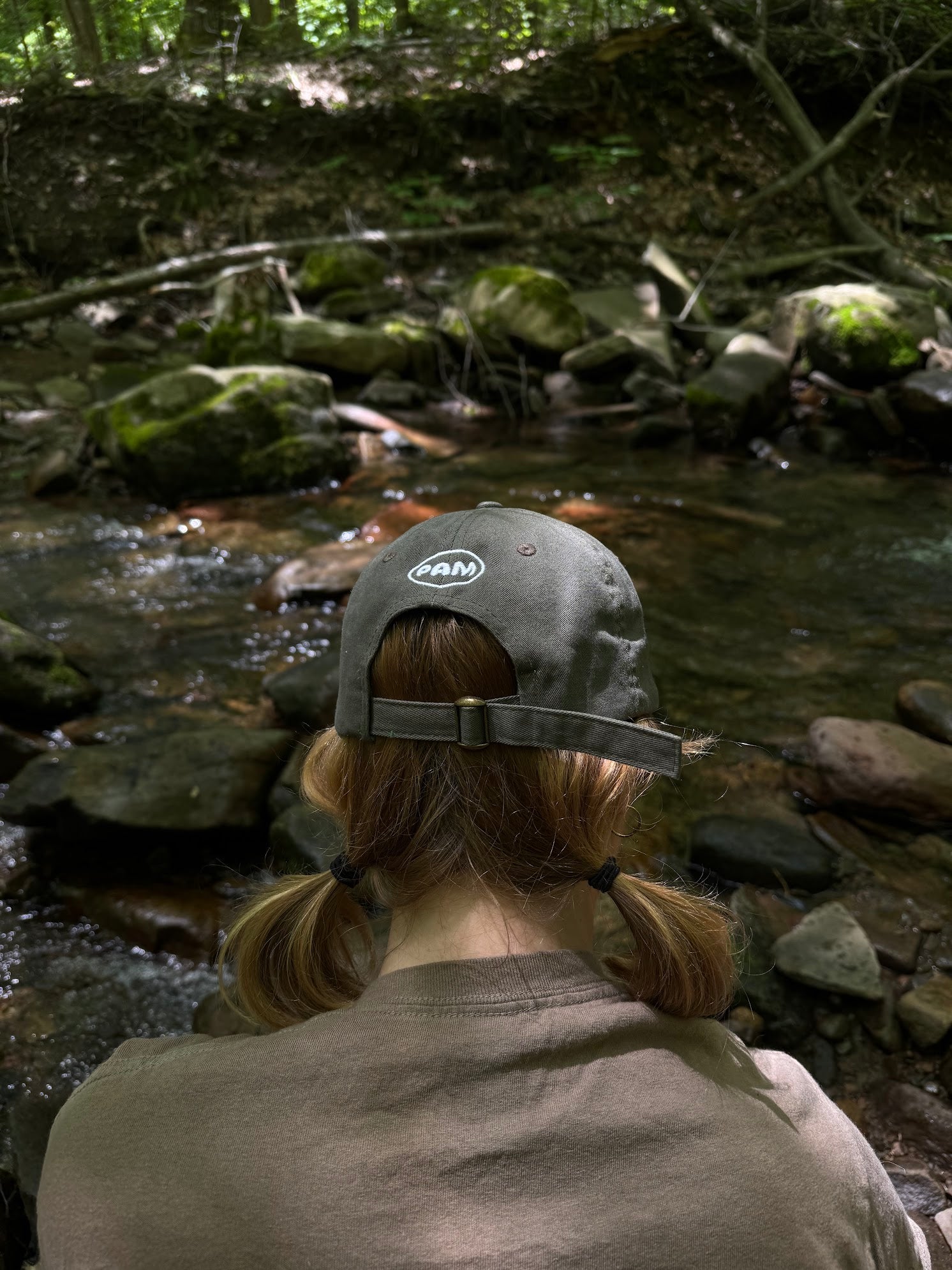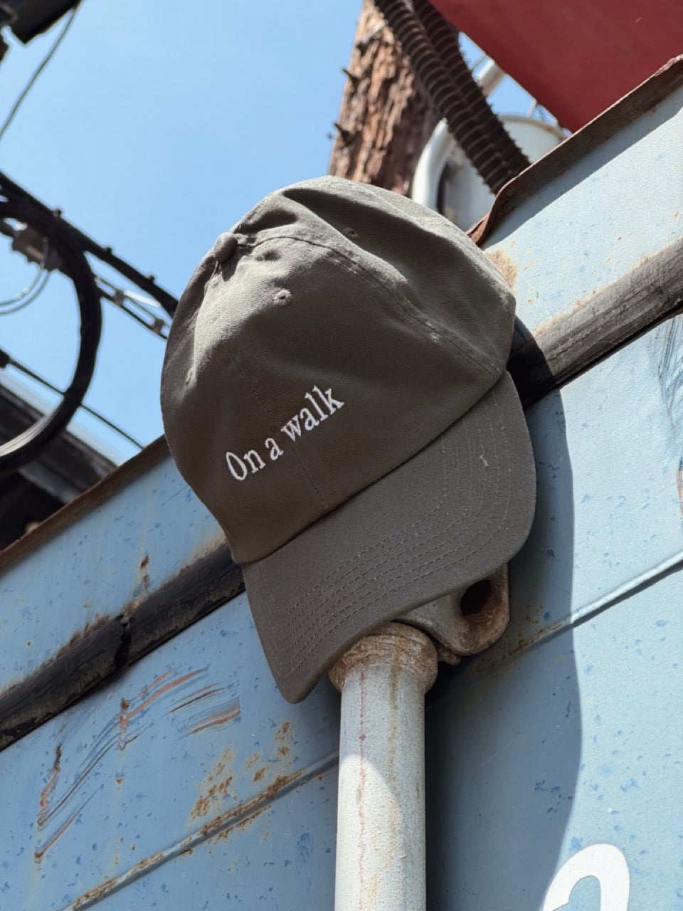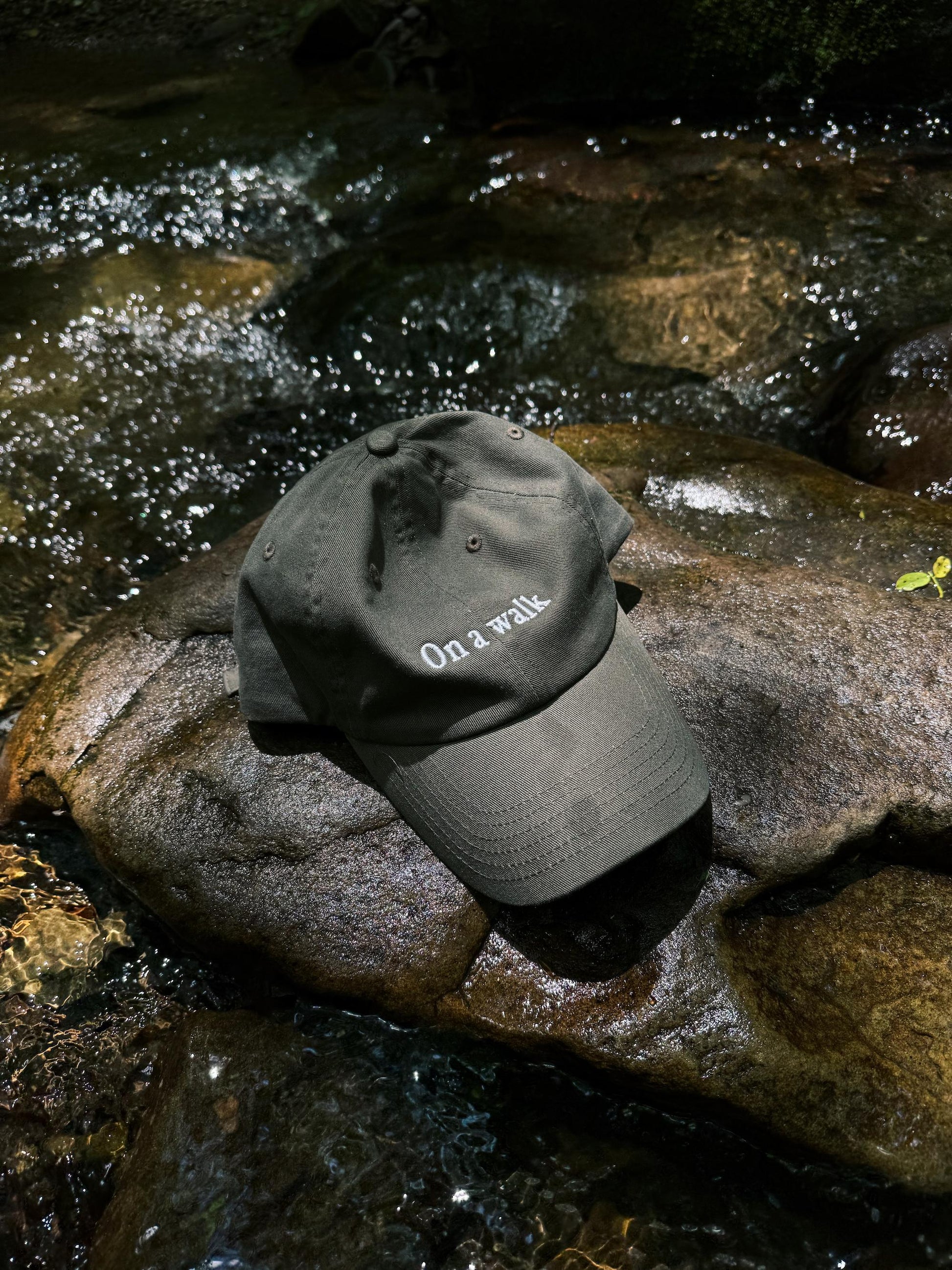 Dark green, cotton hat, "On a walk" stitched on the front, PamPam logo on the back.